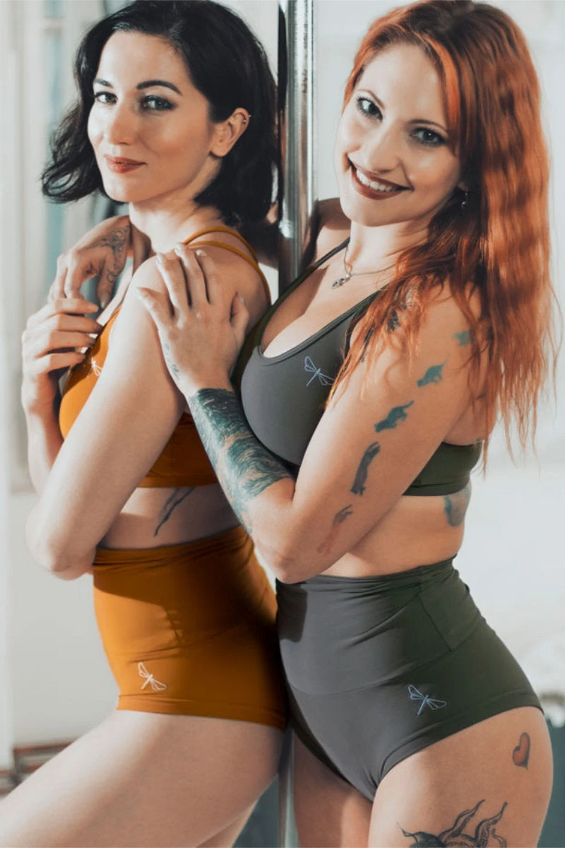The Nicole top is a classic shorts bra with twist. With full chest coverage and strappy cross over back straps this top is supportive and allows for maximum grip from the shoulder area – perfect for nailing shoulder mount tricks!Â